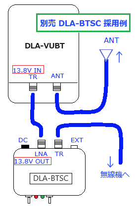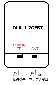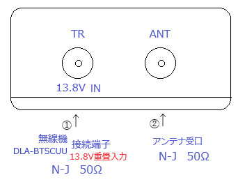 @TR 13.8V IN ・・・・・13.8V電源同軸重畳のトランシーバー or DLA-BTSC 接続端子 13.8V電源重畳の同軸で接続します 50Ω N型 A ANT ・・・・・アンテナ受口 50Ω N型 |