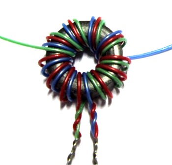 50Ω⇔300Ω平衡変換整合 コア巻き方例 フェライトコア FT-50-75に0.32mmETFE線25cm3本(色別線)を使います@赤線を11回巻ます(コア内通過数) ➁赤線と並行に青線を8回巻きしますB反対側から、緑線を8回巻ます C赤線両端と逆側の緑線と青線を各々結線します