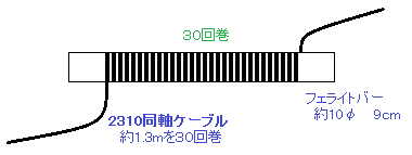 同軸ケーブルとフェライトバーを使用して、静電シールドタイプの マグネチック・フェライト・ループアンテナを作りますこのアンテナは、磁界検出型で、電気的ノイズを受けにくいようです 細同軸ケーブル 2310を使ってフェライトバーに巻き付けて作ります 簡易な受信用アンテナなので直に同軸で接続します---別途、AMチューナーなどの300Ωアンテナ入力端子用にインピーダンス / 平衡、変換整合器も作ります---